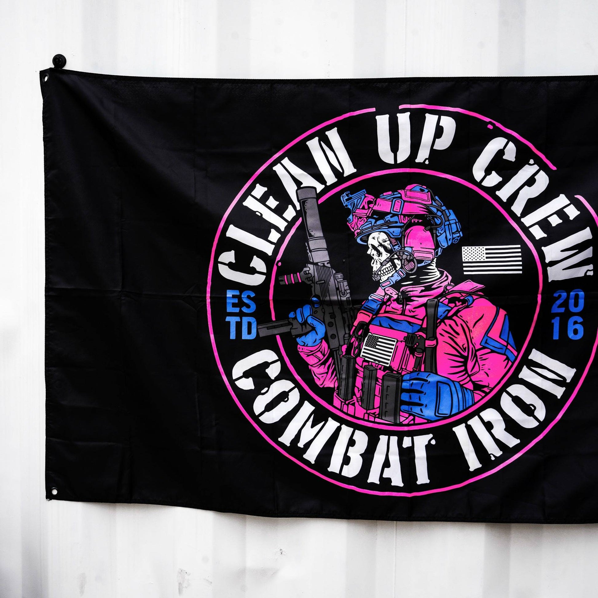 A best selling design, now ready to hang on the wall! CLEAN UP CREW Design is perfect with the bright, Miami style print. Perfectly designed for the gym, garage, briefing room and more. Crafted from high-quality bright nylon, our flag is built to motivate those around. The durable construction ensures that it will withstand the elements and continue to look great for years to come.