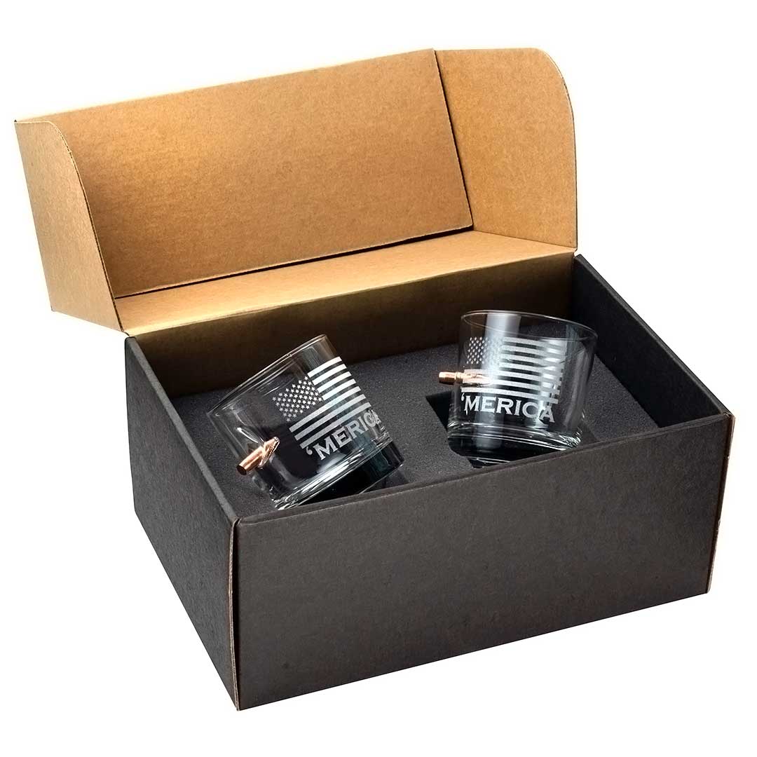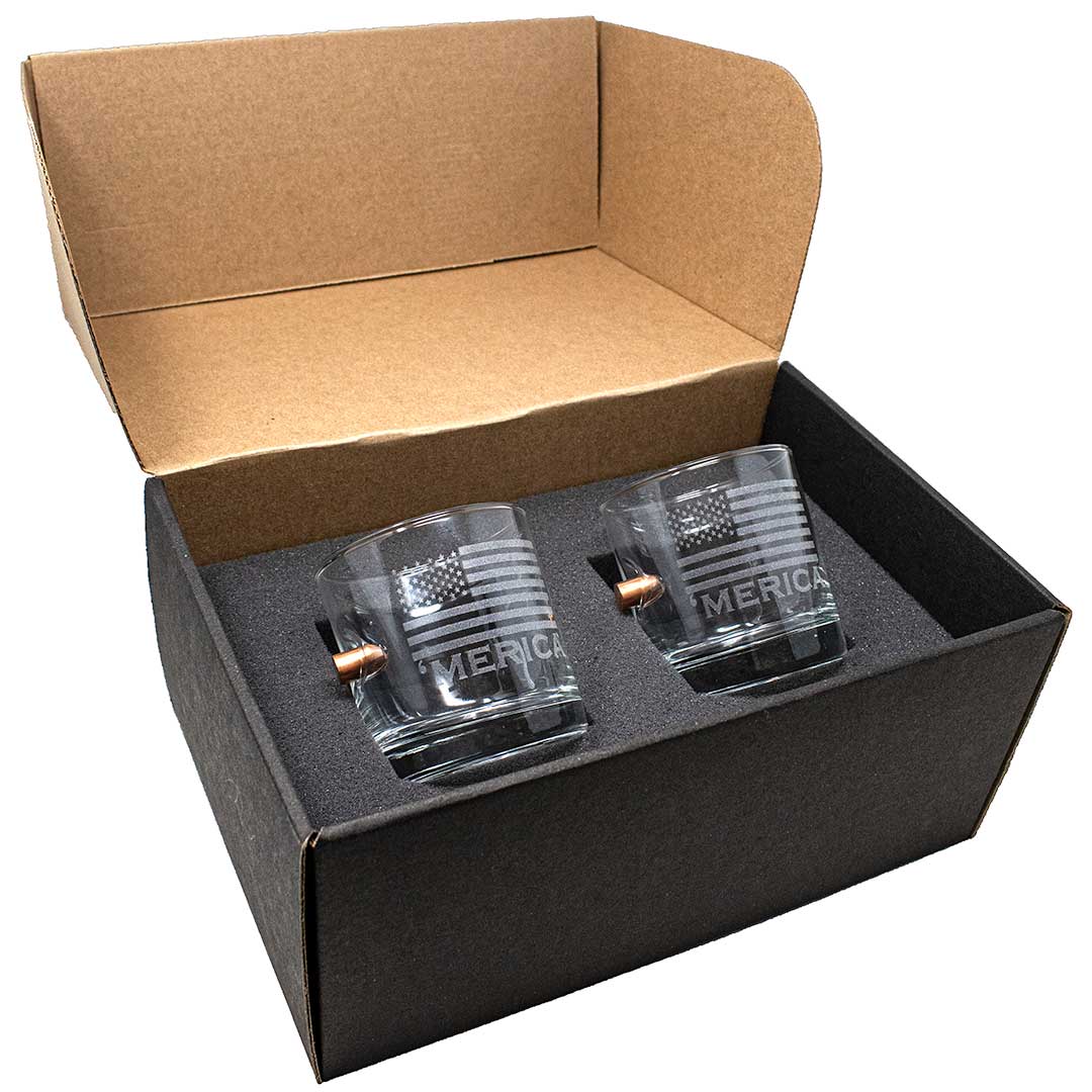 This 11oz whiskey glass is hand-embedded with a real, lead-free 0.308 or 0.45ACP bullet and laser etched with our best selling 'Merica design.