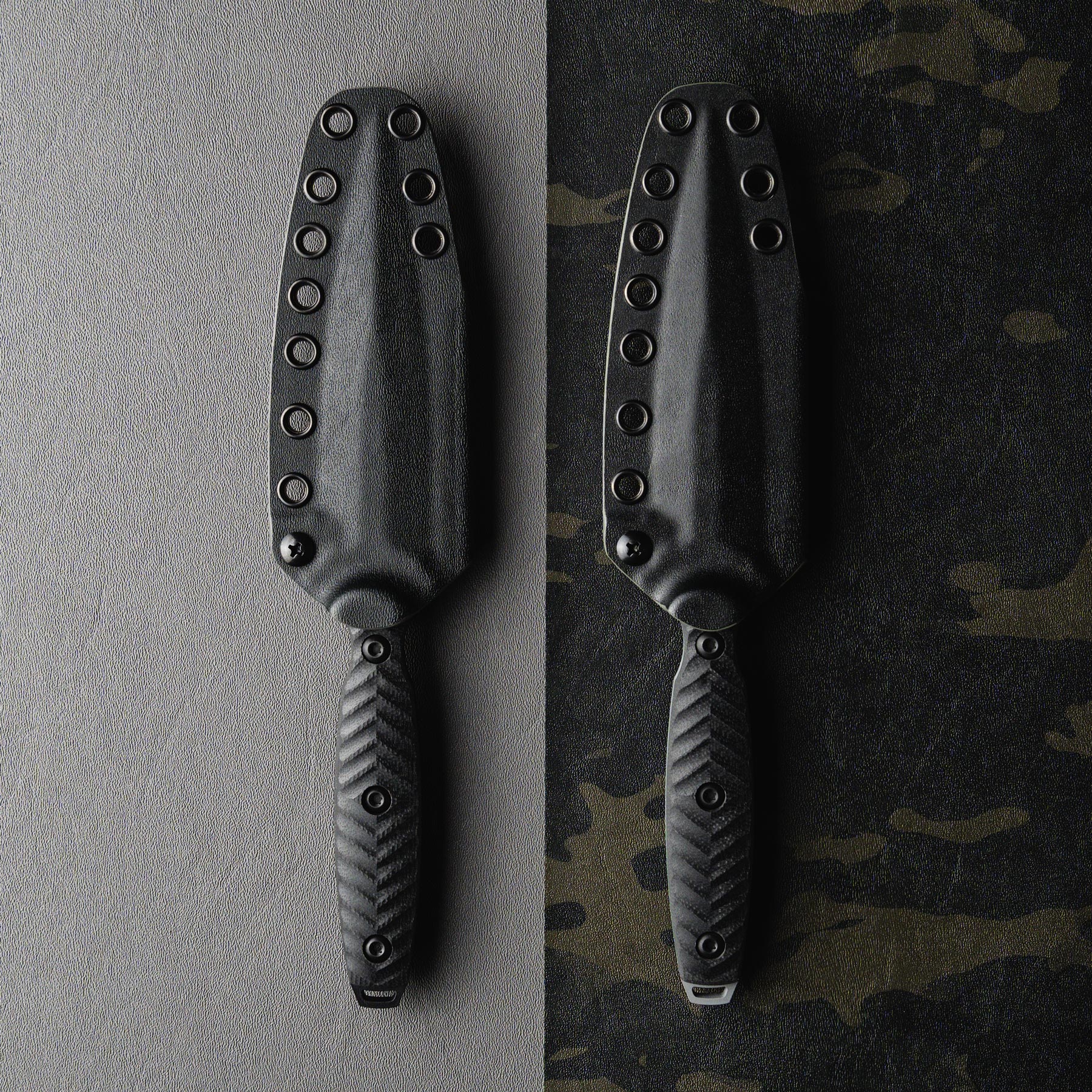 Made from CPM M4 steel, the Specter’s 4.75” blade is cloaked in KG Gunkote, giving it a stealth finish. Available in Phantom Grey and SOCOM Black, each is entirely made here in San Diego, California by our skilled and talented manufacturing team. Every Specter includes a DuoTone™ KYDEX® sheath, with easy retention adjustability and multiple friction offsets to eliminate blade rattle.